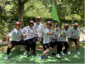 下車后步行幾十米,爬了高高的臺階,來到了一片大草地,這對于我們平時不運動的人來說,真的夠嗆!老鷹教官說我們將在這里舉行我們的第一個活動:“趣味團建”于是乎“戰爭的號角”拉響了!