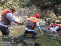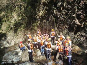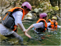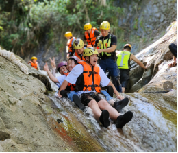 第三個活動:溯溪,據說俠客谷的五都溪是福建戶外組織公認的最精致溯溪線路。出發前教練講解的時候說是如何飛檐走壁如何的困難,于是經過大部隊的商議,我們決定選擇半程,以感受一下的心態來完成此次挑戰,誰料完成了半程后伙伴們似乎意猶未盡,教練告訴我們,溯溪的前半段算是比較輕松的,困難出在于后半程,目前為止,只有僅僅百分之三十的團隊選擇走完后半程,完成全程的挑戰!大家聽后異口同聲的說:我們要完成全部挑戰!于是教練帶領著我們涉水而行、深潭泅渡、崖壁攀爬、高臺跳水、滑梯戲水、瀑布速降……我們完成了!我們完成了!我們就是那個百分之三十團隊中的一員,大家沒有因為勝利緊緊的擁抱在一起,但是溢于言表的喜悅跟自豪讓我們的心卻更近了!